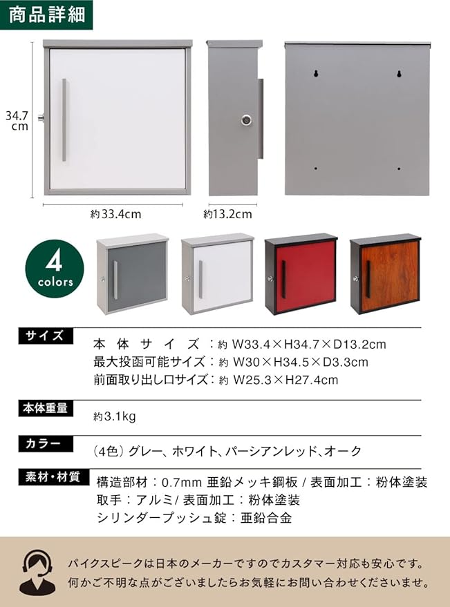 ✅【仕様 / セット内容 / HOT保証】【仕様】本体サイズ:約幅33.4cmx高さ34.7x奥行13.2cm、本体重量:約3.1kg、最大投函サイズ:約幅30x高さ34.5x厚み3.3cm、前面取り出し口サイズ:約幅25.3x高さ27.4cm、素材・材質:構造部材:0.7mm 亜鉛メッキ鋼板 / 表面加工:粉体塗装、取手:アルミ / 表面加工:粉体塗装、シンダープッシュ錠:亜鉛合金【セット内容】本体x1、カールプラグx1、ネジx4、スペーサー 4、鍵x2、取扱説明書x1【HOT保証】PYKES PEAKは日本のHOTです。カスタマー対応も日本人スタッフが日本語で丁寧に対応いたします。初期不良や故障などの場合は、当社サポートまでご気軽にご連絡ください。製品保証を含めご対応させて頂きます。