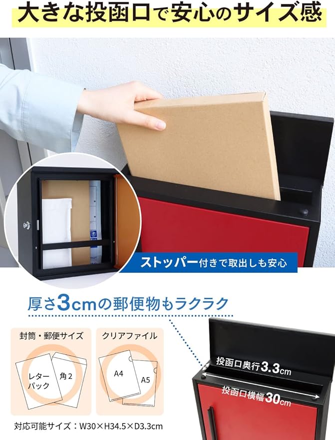 ✅【大きな投函口】3センチ厚さの郵便物も楽々入る大きな投函口!レターパックやクリップポスト、回覧板、雑誌、パンフレットなどを投函可能です。※レターパックは投函口からの取り出しになります。