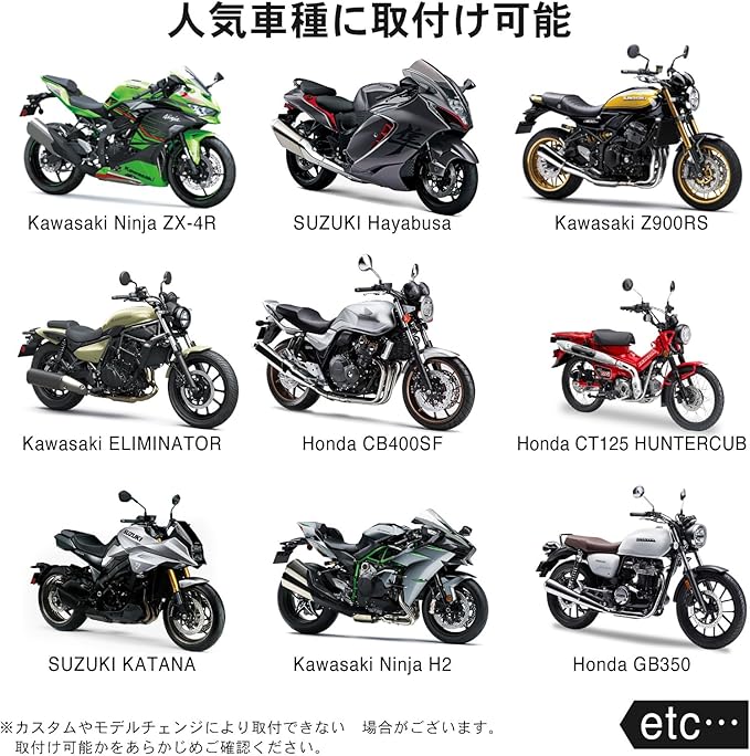 適合車両のタイプ BMW, Ducati, HONDA, Harley-Davidson, KAWASAKI, SUZUKI, YAMAHA, 汎用
