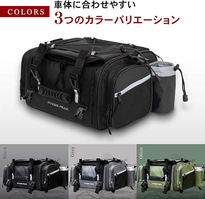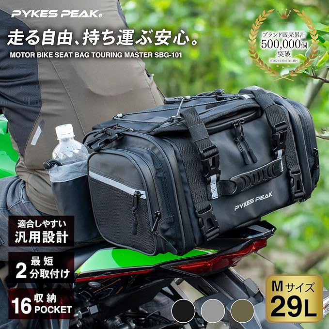 PYKES PEAK バイク用 シートバッグ 18L 29L 大容量 レインカバー付き 固定ベルト ショルダーベルト 付き バイク ツーリング アウトドア キャンプ ツーリングバッグ リアバッグ ツーリングマスター 【グレー 中型 Mサイズ】