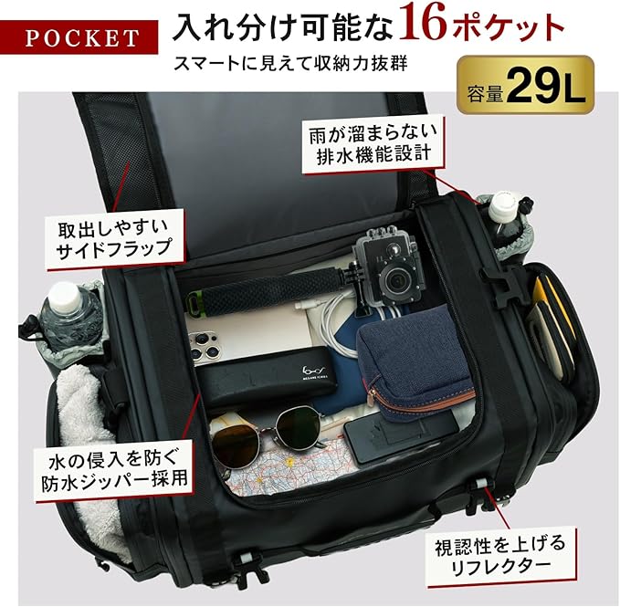 ✅【雨の侵入を防ぐ細かな工夫】バッグ全体の素材は水がかかっても浸透しにくく、高級感のあるPVC素材。ジッパー箇所は防水加工が施されたジッパーを採用されており、ライダーの敵である雨の浸透・侵入を防ぎ荷物を守る設計になっています。