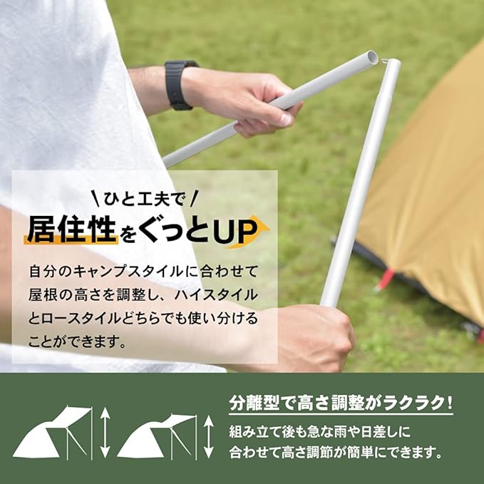 【多種多様なギアとの組み合わせ / サクッとかんたん高さ調整】ドームテント・ワンポールテント・パップテント(軍幕テント)などテントのキャノピー部分、もしくは小型タープのメインポール・大型タープのサブポールなどご自身のキャンプギアと組み合わせて使うことで、テントやタープの力を最大限まで引き出すことができます。【高さ調整可能】テントポールの使い方は2つだけではありません。自分のキャンプスタイルに合わせてハイスタイルとロースタイル使い分けることができます。高さ調整も簡単で、急な雨などの天候の変化に応じて調整することもできます。