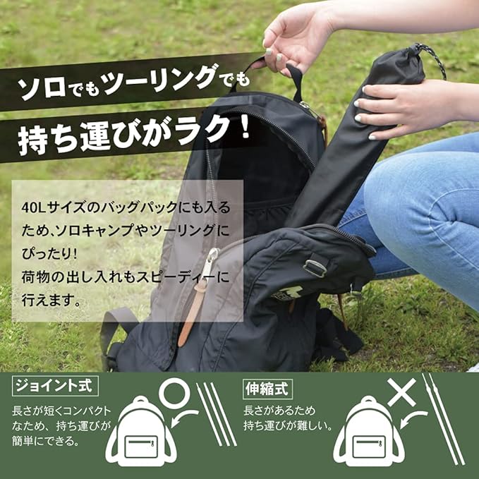 【コンパクトで抜群の携帯性&収納性】キャンプする上でとても気になる、荷物量の問題も心配する必要はありません。コンパクトかつ軽量化されたポールなので持ち運びが簡単!キャンプには必需品のトランクカーゴや41Lサイズのバッグパックにも入り、荷物の出し入れもスピーディーに行えます。日帰りキャンプ、ソロキャンプ、キャンプツーリングにもおススメです。伸縮式のテントポールを比較すると、ジョイント式の方が一番短くしたときの長さが短く、バッグパックやキャンプ用カーゴに入らないという心配もありません。また、ジョイント式は上からの力に強く、風が吹いたり雨が降ったりしてもズレにくく、安定性を確保しやすくなります。