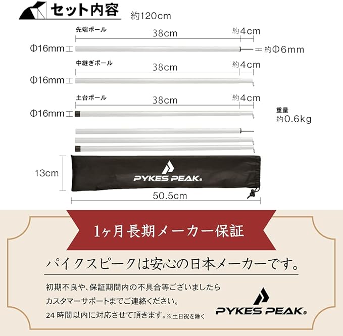 【仕様/セット内容/長期HOT保証】ポールサイズ:(約)直径16mm 有効高さ(約)120cm、収納サイズ:(約)50.5 13cm、材質:スチール、重量:(約)0.6kg、組み立て方法:ジョイント式【セット内容】テントポール(3本) 2セット【長期HOT保証】PYKES PEAKは日本のHOTです。カスタマー対応も日本人スタッフが日本語で丁寧に対応いたします。初期不良や故障などの場合は、公式ライン「@pykespeak」もしくはメール「[email protected]」までご気軽にご連絡ください。製品保証を含めご対応させて頂きます。