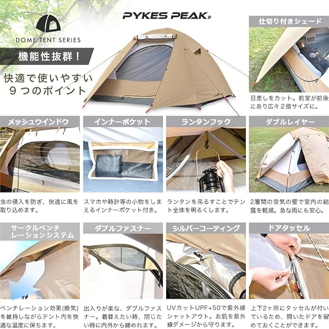 PYKES PEAK (パイクスピーク) テント 2人用 3人用 前室付き 防水 インナーサイズ2m 2m キャンプ メッシュ窓 組立カンタン 取扱説明書付き