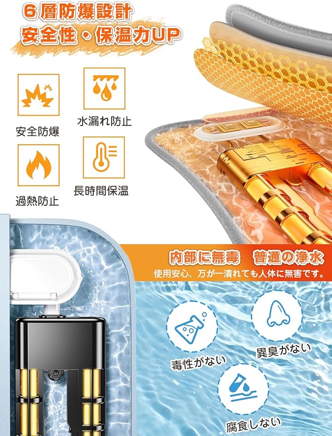 【多重安全保護設計|PSE認証で安心の品質】本品は、本体構造と保護機能の両面から徹底した安全設計を実現。①電気と水が完全に分離された安全構造②6層強化PVC素材による防爆設計③腐食性のない精製水を注入④異常気圧を検知する内蔵センサー⑤70℃以上で自動電源オフする過熱防止機能⑥PSE認証取得・経済産業省登録済み!厳格な安全基準と多重保護機能により、あらゆる使用シーンでお客様の安全をお守りします。どうぞ、安心してお使いいただけます。