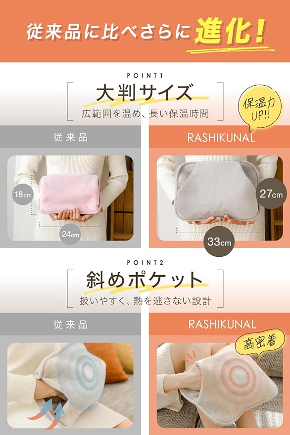 ✅【27 33cm、大判サイズの電気 湯たんぽ 】 ウォーターベースの湯たんぽだから柔らかく密着、ホッとするやさしいあたたかさ。お腹や腰など広範囲を長時間温めるエコな 蓄熱式 。熱を逃がしにくい斜めポケット付き。冷えやすい手指を差し込めば、芯からホカホカの あったかグッズ 。