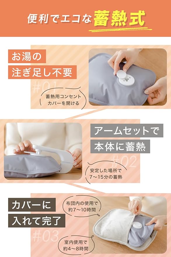 ✅【最長持続時間10時間、蓄熱1回2円で 省エネ 】充電式 で繰り返し使える 電気湯タンポ 。お湯の継ぎ足しや レンジ での温めは不要。7~10分で蓄熱完了。就寝前の布団に入れて最長約10時間、室内使用で約4~8時間、ずっとあたたかさが持続します。