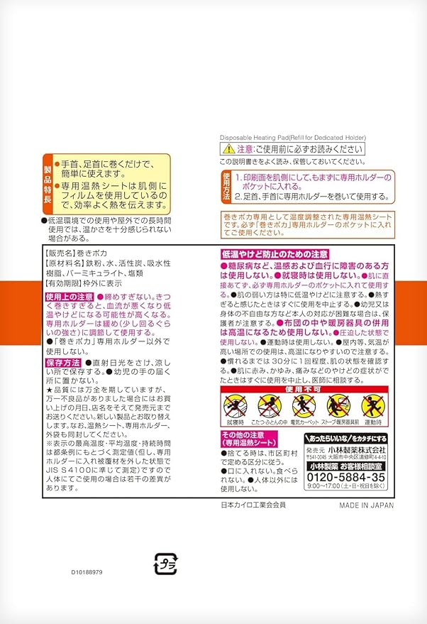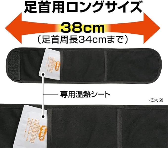 足首に巻くだけぬくもり伝わる 家事に 通勤に 専用ホルダー2個入 足首用ロングサイズ 38cm(足首周長34cmまで) 専用温熱シート4個入り 専用温熱シート<貼らないタイプ> ●裏面もよくお読みください ●肌に直接あてないこと ●低温やけどに注意すること ●最高温度60℃※ ●平均温度48℃※ ●持続時間6時間※(専用ホルダー内で使用した場合、40℃以上を保持する時間) ●9cm 7cm(4個入) ●使用環境や体調によっては、効果の感じ方に差異が生じる。 ●装着部の体温低下を緩やかにするもので、屋外使用は短時間を想定している。長時間の屋外使用や体が冷えきる場面では充分な効果を得られないことがある。 ※表示の最高温度・平均温度・持続時間は都条例にもとづく測定値(但し、専用ホルダーに入れ被覆材を外した状態でJIS S4100に準じて測定)ですので人体にてご使用の場合は若干の差異があります。 こんな使い方も・・ 仕事中に 家事中に リラックスタイムに 専用ホルダー 巻くだけ簡単。足首の太さに合わせて程よく固定。 適応サイズ:足首周長34cmまで 専用温熱シート 薄型・軽量の専用温熱シートです。 肌側には熱を効率的に伝える素材を使用しています。 <製品特長> ●足首に巻くだけで、簡単に使えます。 ●専用温熱シートの肌側には、熱を効率的に伝える素材を使用しています。