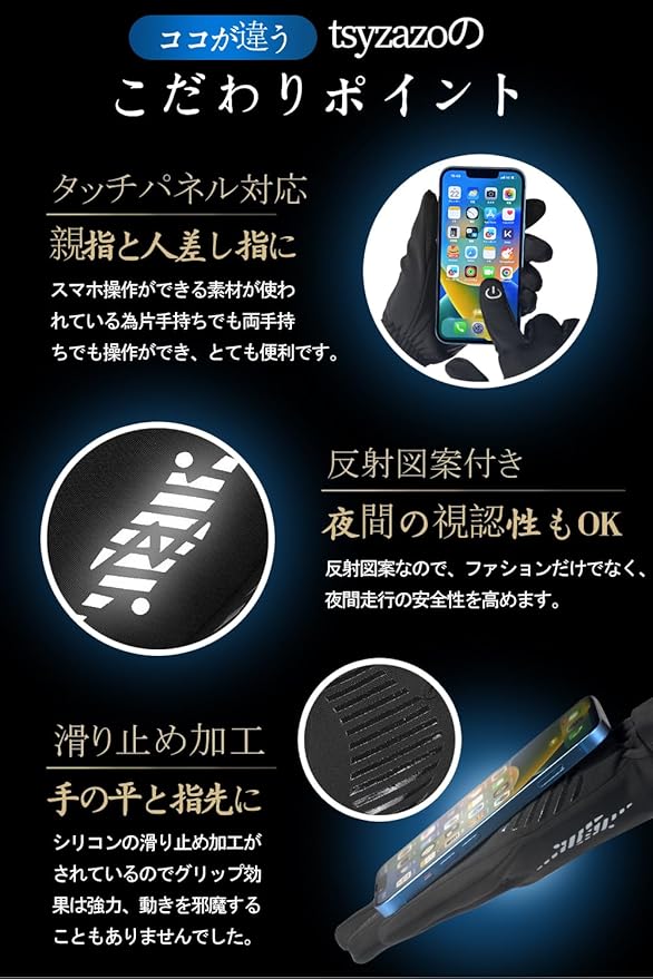 【タッチパネル対応・反射図案付き】親指と人差し指にスマホ操作ができる素材が使われている為片手持ちでも両手持ちでも操作ができ、とても便利です。反射図案なので、ファションだけでなく、夜間走行の安全性を高めます。