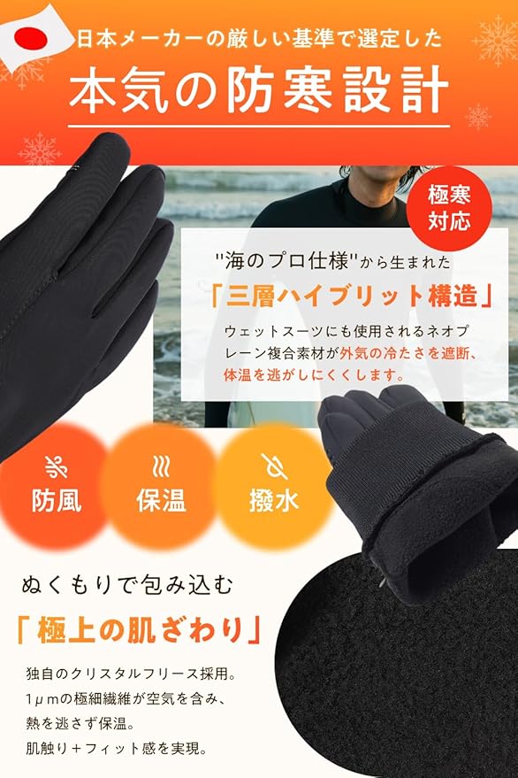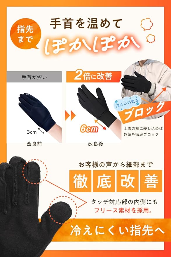 ❄️【細部まで改良された快適性】 手首部分を6cmのロング仕様に改良し、冷気の侵入を徹底ブロック。スポーツやアウトドアでの使用はもちろん、車やバイクの運転時にも快適。さらに、スマホタッチ部分にもフリース素材を採用し、暖かいまま操作性を確保しました。