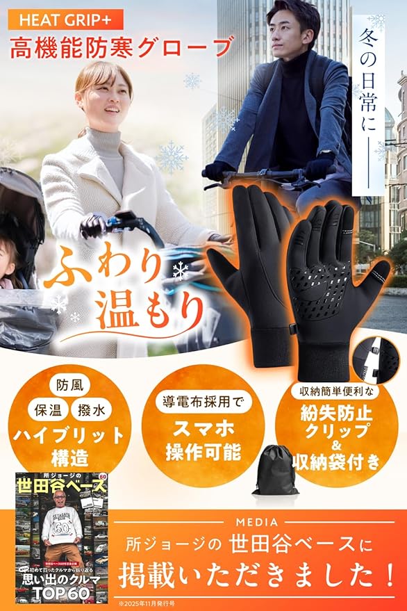 【所ジョージの世田谷ベース掲載】防寒手袋 メンズ レディース 自転車 スポーツ 冬 ["導電布"採用スマホ対応]