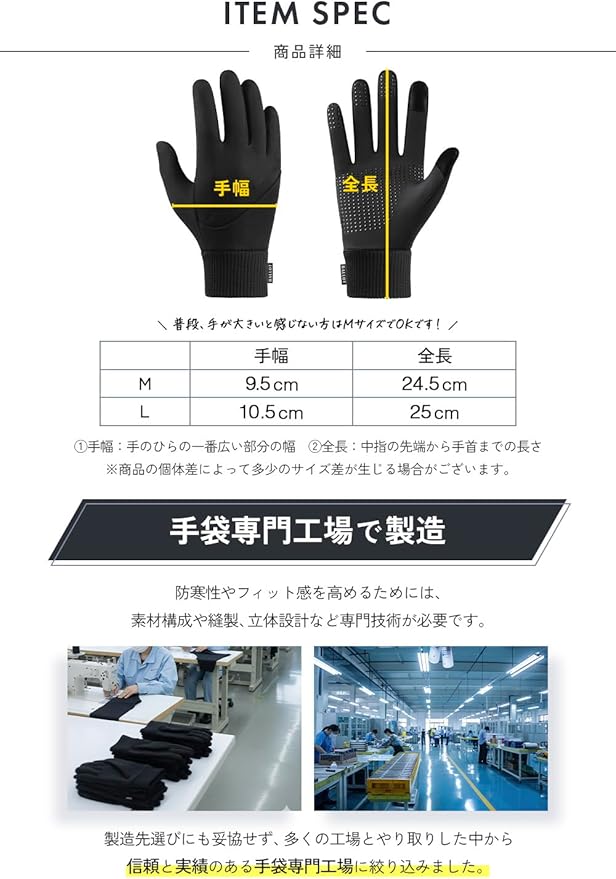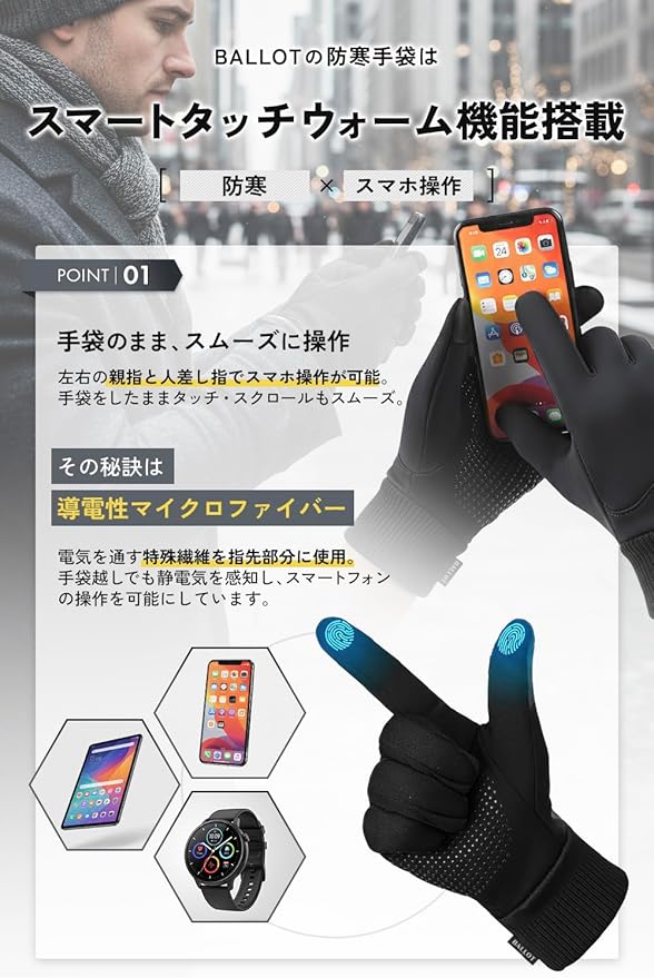 【スマホ対応】手袋をつけたままスマートフォンのタップ・スワイプ操作ができるタッチパネル対応仕様。寒い中でも手袋を外す必要がなく、通勤・通学や屋外作業時のストレスを大幅に軽減します。※スマホ対応部分:親指・人差し指