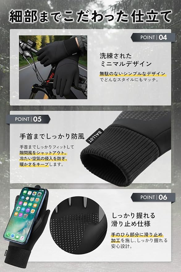 【シンプルなデザイン】装飾を抑えたミニマルなデザインで、性別やスタイルを問わず使いやすい万能タイプ。日常使いからアウトドアまで幅広く馴染みます。さらに、手のひらと指先には滑り止め加工を施しており、グリップ力が向上。自転車のハンドルを握るときや荷物を持つシーンでもしっかりと安定し、滑りにくい安定感を提供します。