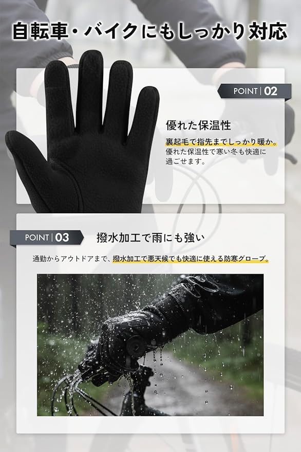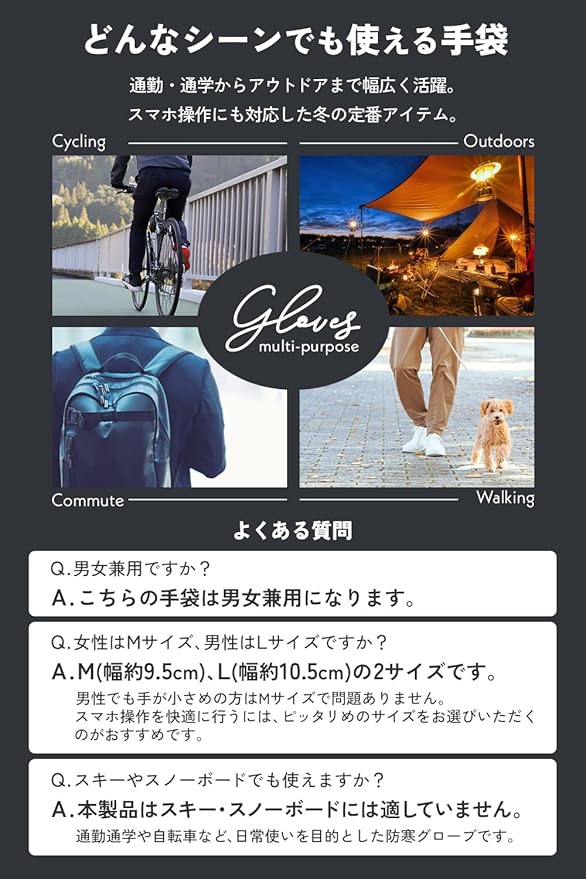 【様々なシーンで活躍】サイクリングや真冬の移動時はもちろん、キャンプ・アウトドア・散歩・ウォーキングなど、幅広いアクティビティで活躍します。防寒性・操作性・耐久性のバランスに優れているため、日常からレジャーまで幅広いシーンで使える便利な手袋です。