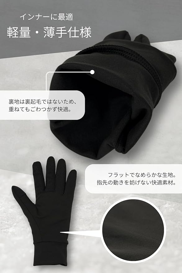 【薄手でごわつかない】裏起毛ではない薄手の生地を採用し、冬用グローブの中に重ねてもごわつかず快適。指先の可動域を妨げず、インナーとして使いやすい着用感です。