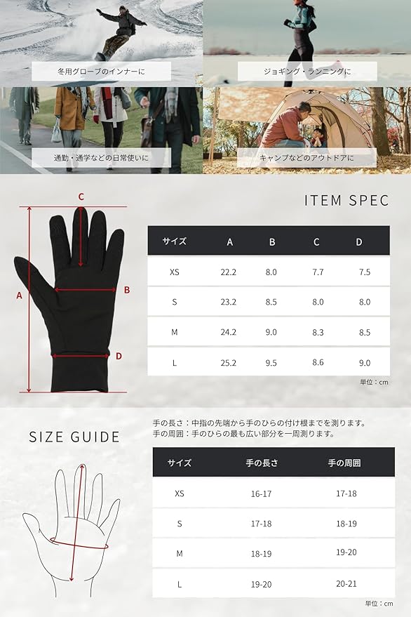 【幅広いシーンで活躍】スノーボード・スキー用グローブのインナーとしてはもちろん、ランニング、サイクリング、通勤・通学、キャンプなど日常からアウトドアまで幅広く活躍します。