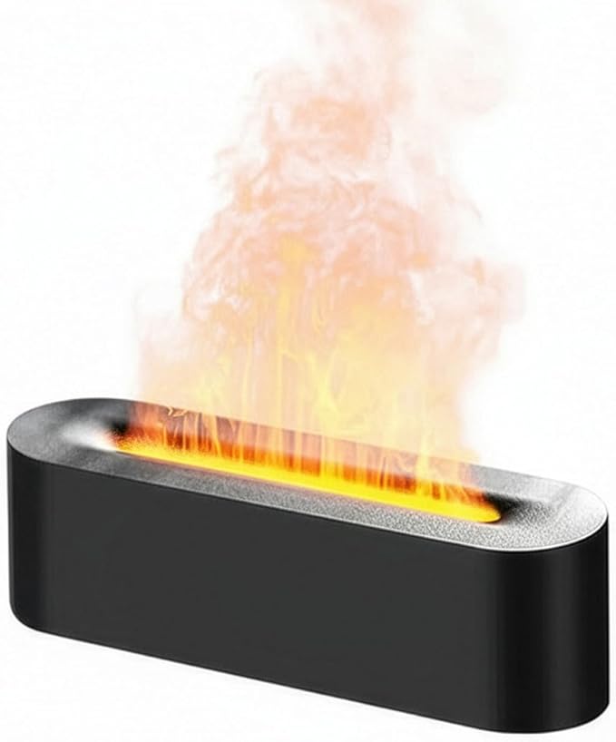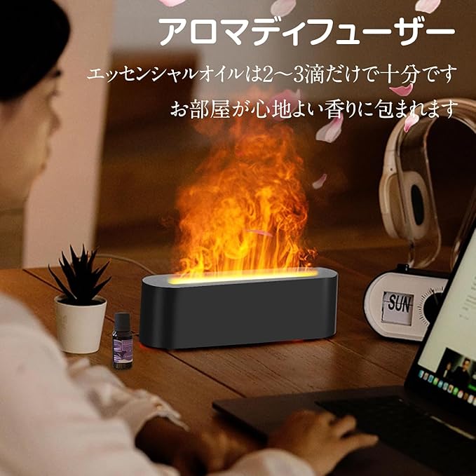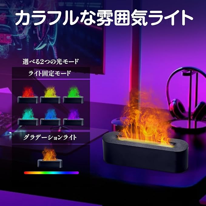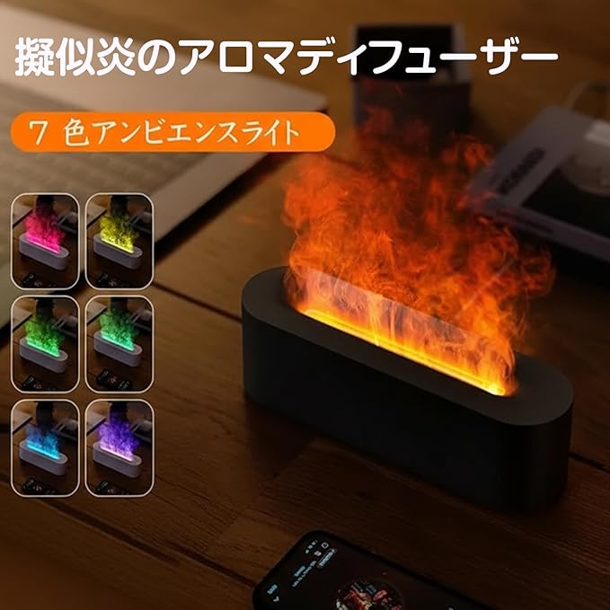 炎 加湿器 アロマディフューザー 卓上 超音波式 小型 静音 7色LEDライト Type-C給電 空焚き防止 自動OFF 寝室/オフィス用 乾燥/花粉症対策 PSE認証 日本語説明書付き(ブラック)