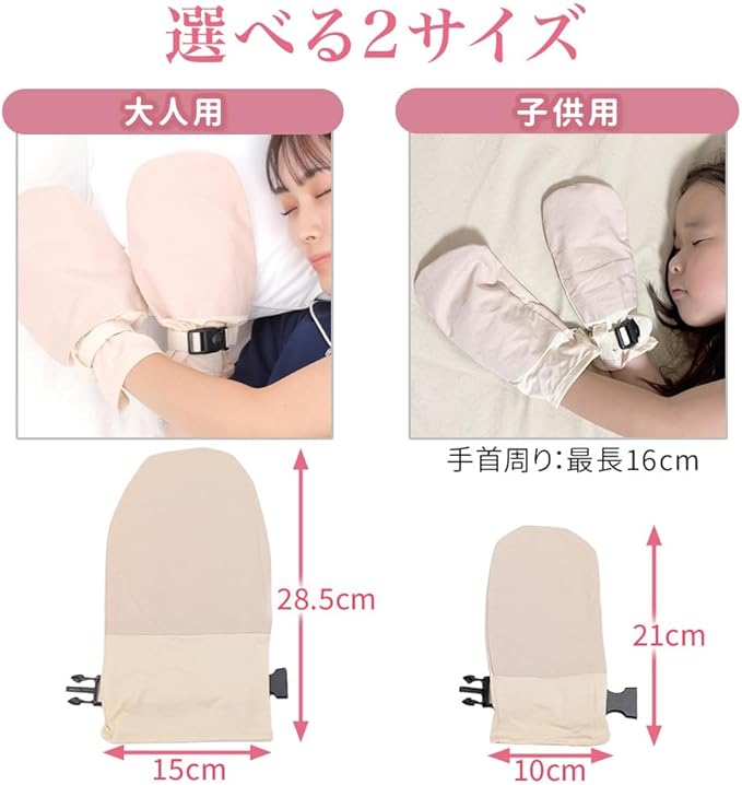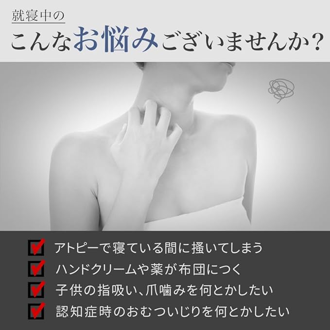 【かきむしり防止グローブ】手荒れやアトピーにお悩みの方の就寝時の、ひっかきやかきむしりによる肌へのダメージを防止してくれる、かきむしり防止ミトン手袋です。
