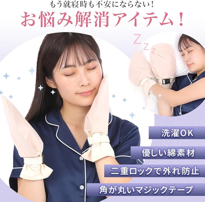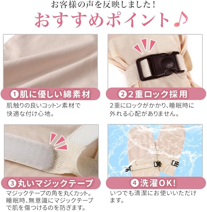 ✅【お客様の声で改良】寝てる間に無意識に外してしまうというお客様もお声に応えて2重ロックを採用。またマジックテープの角で肌を傷つけるというお声にこたえて角を丸く加工しました。