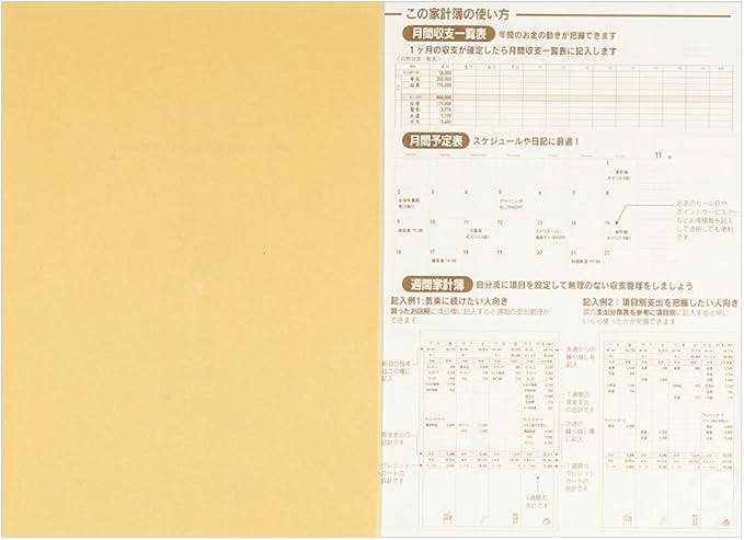 月毎でも週毎でもまとめられる月間+週間タイプ。週間家計簿に見開き1ケ月ブロックのスケジュールが付いた便利な家計簿です。
