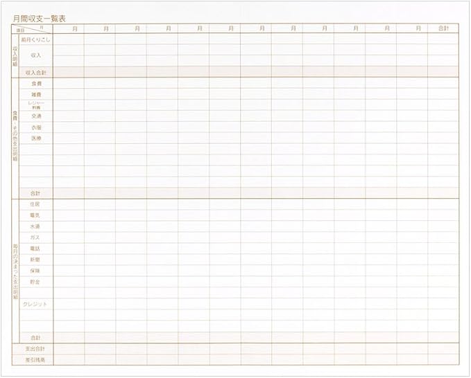 1週間の収支がひとめで比較できる、各月の収支一覧表が付いた使いやすい家計簿。毎日の出費を食費とその他に分割して集計できます。便利な収納ポケット付き。