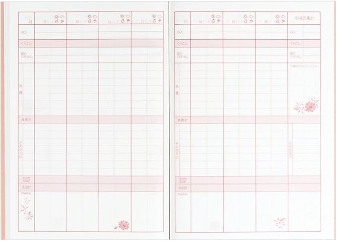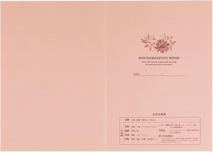内容:中紙/128ページ・使用説明・週間家計簿・贈答品リスト・貯蓄・御用達リスト・メモ・月間収支一覧表(別紙)