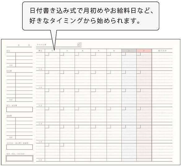 手帳の様なデザインの様になっていて、日付を自身で書き込むタイプなので、自分の好みや、お給料日のタイミングなど、お好きなタイミングから始められます。
