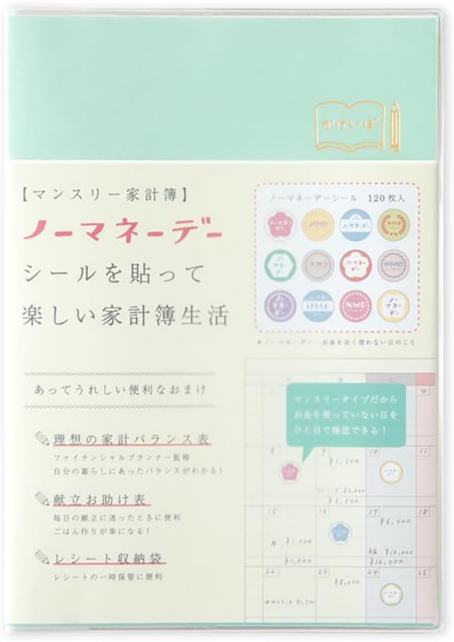 ノーマネーデー 家計簿 マンスリー ミントグリーン・家計簿 A5サイズ 日付なし MHKN-12 ノーマネーデーシール レシート収納袋 リュリュ