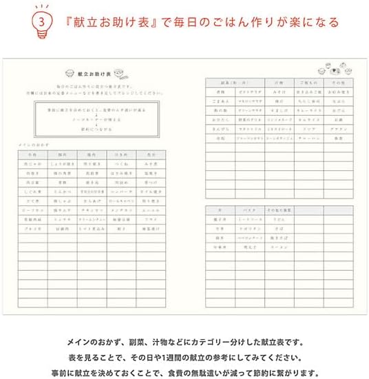 ◇本文内容:理想の家計バランス表、献立お助け表、マンスリーページの使い方、マンスリーページ(12ヶ月分)、ノートシート(罫線入)