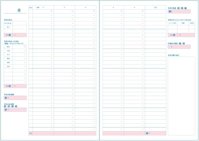 初めての方でも簡単につけられる家計簿です。空欄を埋めるだけで予算が立てられるので貯金がしやすく使い続けやすいのが特徴です。やりたいことリスト・貯金の記録を記入することで先を見据えながら計画することができ、貯金や予算立ての際に役立ちます。