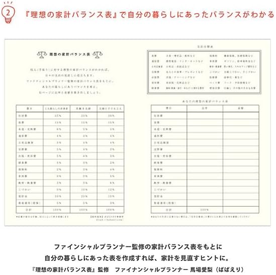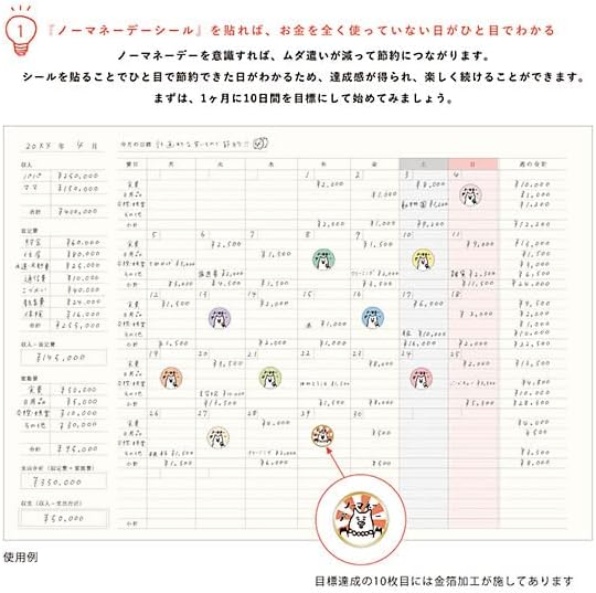 ノーマネーデーを意識して、ムダ遣いを減らすことを目的としたマンスリー家計簿です。 お金を使わなかった日に、付属のノーマネーデーシールを貼る事で楽しくノーマネーデーが意識が出来ます。 本文は、家計簿初心者さんでも始めやすいマンスリータイプ。 手帳の様なデザインの様になっていて、日付を自身で書き込むタイプなので、自分の好みや、お給料日のタイミングなど、お好きなタイミングから始められます。 家計簿ページ以外にも、ファイナンシャルプランナーが監修した、自分の暮らしにあった理想の家計バランスが解る「理想の家計バランス表」や、主婦の声から生まれた「献立お助け表」もついて、家計の見直しに役立ちます。 ■ノーマネーデーとは? ノーマネーデー(NMD)とは、お金を全く使わない日のこと。