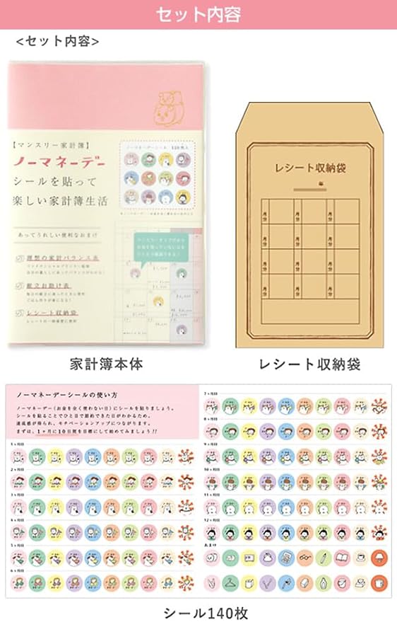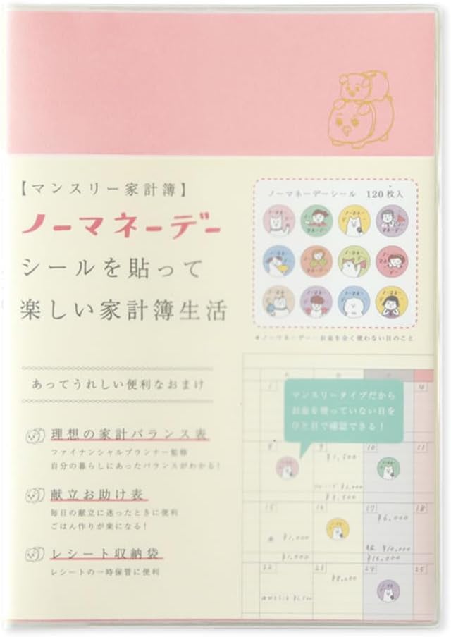 ノーマネーデー 家計簿 マンスリー ピンク・貯金箱 A5サイズ 日付なし MHKN-09 ノーマネーデーシール レシート収納袋 リュリュ