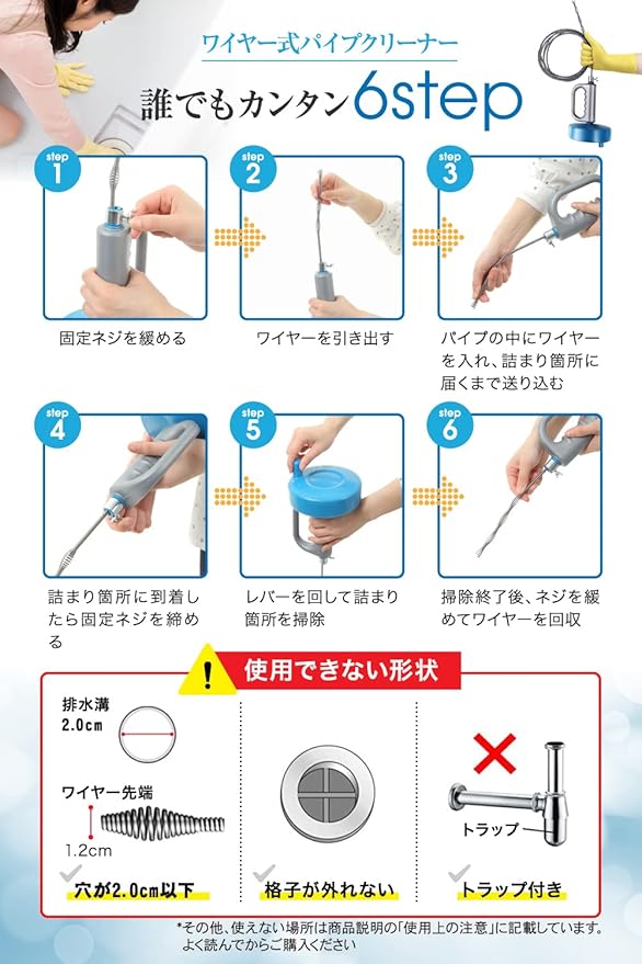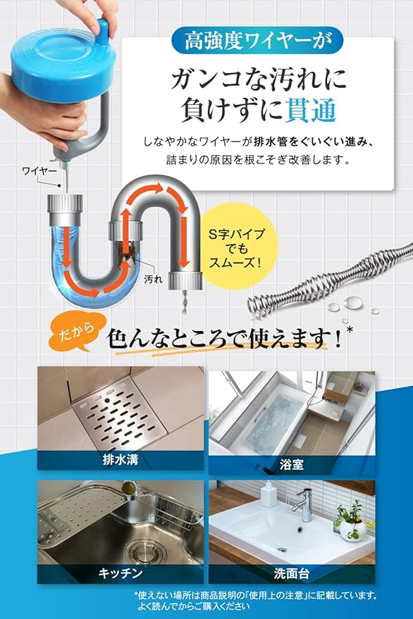 【業者を呼ぶ前の最終手段】業者に頼らずに水回りトラブルを解消できる*、家計に優しいパイプクリーナーです。液体タイプやラバーカップで解消できない詰まりも、ワイヤーで取り除くことが出来ます。*本商品はワイヤーをドリルのようにで回転させ、つまりに物理的に干渉し、解消することを目的とした商品です。 状況によっては解消できない場合がありますことをご理解の上、ご使用ください。