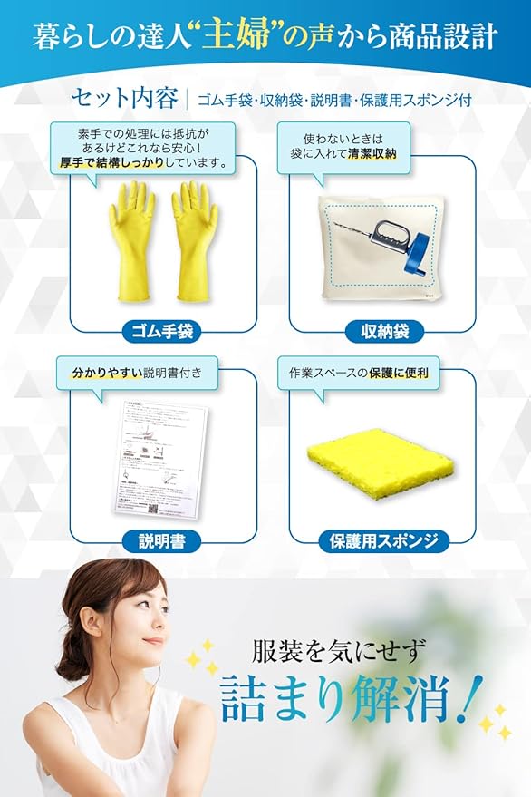 【安心!綺麗!厚手のゴム手袋付き】作業中はワイヤーを持ち、排水溝や汚れに触れます。汚れやケガを気にせず、安心して作業頂くために、厚手のゴム手袋を同梱しております。届いた瞬間スグ作業できる排水管掃除道具セットです。