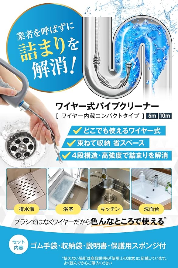 【様々なシーンでご使用可能】台所、洗面台、お風呂、トイレ、P字、S字パイプ等、様々なところでお使い頂けます。業務用清掃ブラシとしても大活躍。*2cm以下の穴、格子形状の排水口、トラップ付きパイプにはご使用頂けません。P字、S字の場合でもつまりの状態や配管の太さなどによってはご使用できない場合があります。キッチンやトイレ等、排水パイプの形状によっては通らないものがあります。あらかじめ、排水パイプにワイヤーが通るか、管理会社等にご自宅の構造をご確認ください。【使用上の注意】5mの場合:4.5m、10mの場合:9.5mを超えると、ワイヤーが本体から抜け落ちます。 ワイヤーを排水溝に落とさないよう、ワイヤーの残りに気を付けてご使用ください。【ご使用後】汚れを水洗いし、水をふき取り、出来るだけ早くご家庭にある錆止めオイルを塗ってください。放置するとサビの原因になります。ワイヤーを本体に収納した後、付属の収納用手提げ袋に入れて保管します。