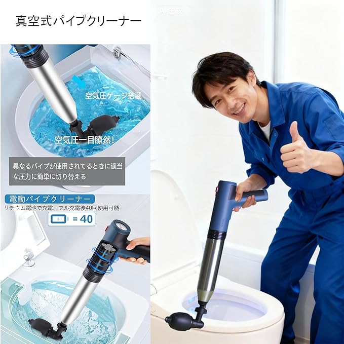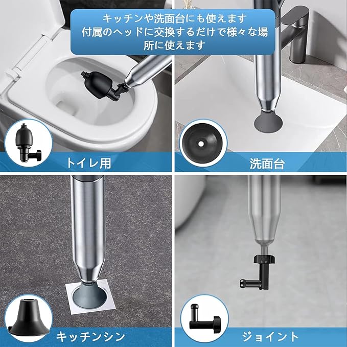 【適用範囲が広い】4つの異なるゴムヘッドが付属して、多くのタイプのパイプの诘めに適して、状況によってゴムヘッドを選ぶことができます。パイプ掃除機は、トイレ、排水口、キッチンのシンク、シャワー、床の排水口、バスタブ、トイレ 風呂、台所、洗面台の排水管?排水パイプなどに使用でき、髪の毛、布、油、その他のゴミによる詰まりを取り除くことができます。