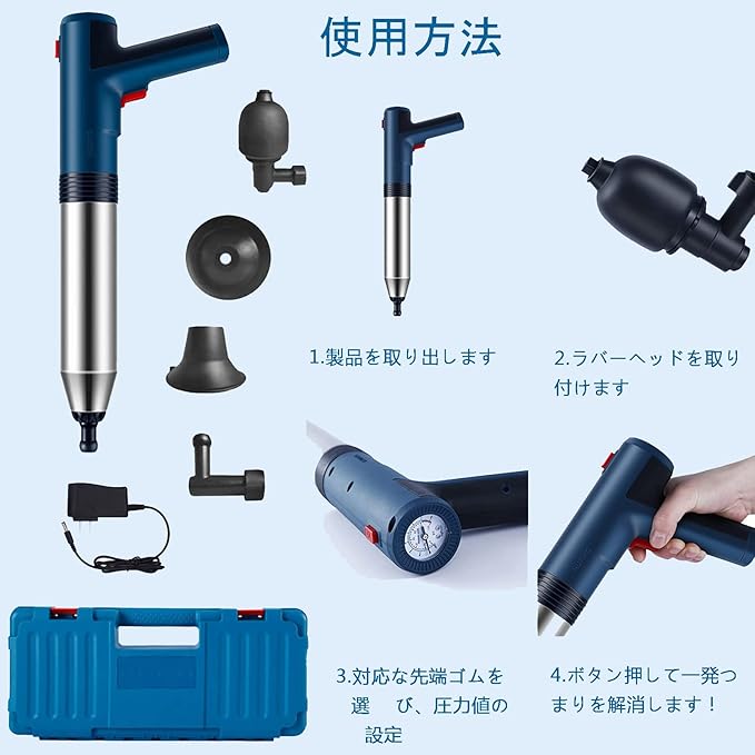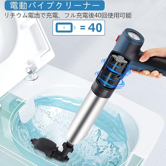 【電動式 トイレつまり解消道具】従来の手動タイプと比較して、より効率的で便利であり、お年寄りや女人でも手間をかけずに手軽にご使用いただけます。使い方は簡単です。2回ボタン押すだけ、一回目押して空気を溜めて、二回目押しつまり解消。(日本語説明書付き)