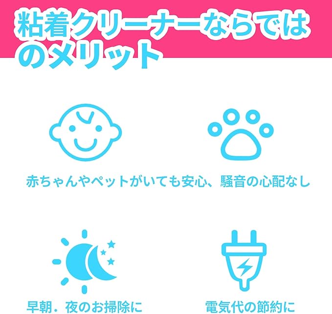 強力粘着で徹底清掃:カーペットや服のホコリ、ペットの毛、髪の毛などをしっかりキャッチ。繰り返し使える粘着クリーナーで、お掃除が簡単に。