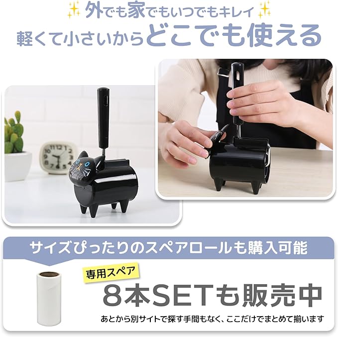コロコロクリーナー 持ち運び ねこ 粘着クリーナー テープ ホコリ 掃除 カーペット【CocoFill】 (ブラック)