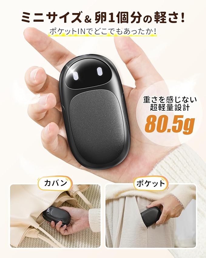 ✅【超軽量・コンパクト・携帯便利】HAGOOGI電気カイロは95 52 20mmの手のひらサイズ。握りやすさを追求した薄型デザインで、ポケットやバッグにすっきり収まります。小さなお子様や女性でも使いやすく、指先までしっかり温めます。寒い朝の通勤や通学、厳寒地、屋外、学校、キャンプ、雪山、登山、野外ライブ、釣り、スキー、スノボ、雪遊びなど、寒い日の外出のお守り代わりに活躍します。冬の外出を快適にする頼れるアイテムです。