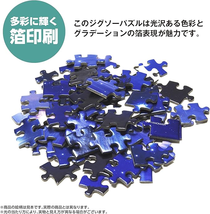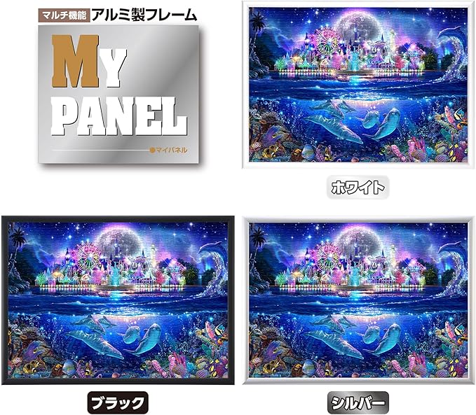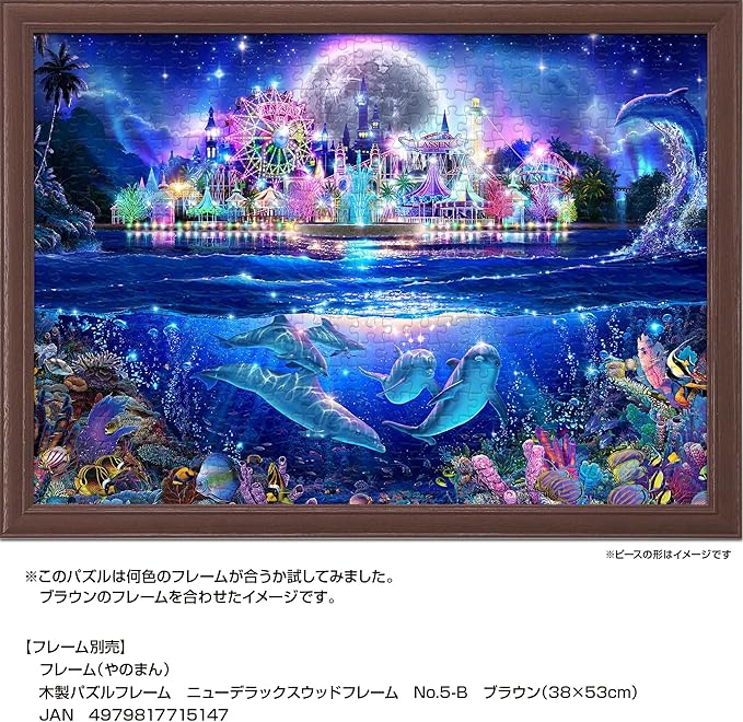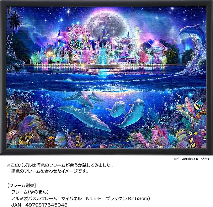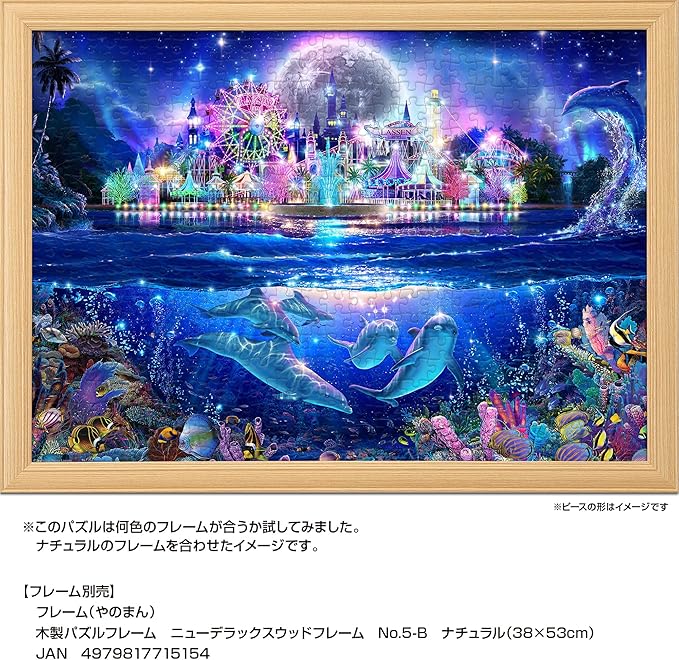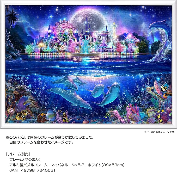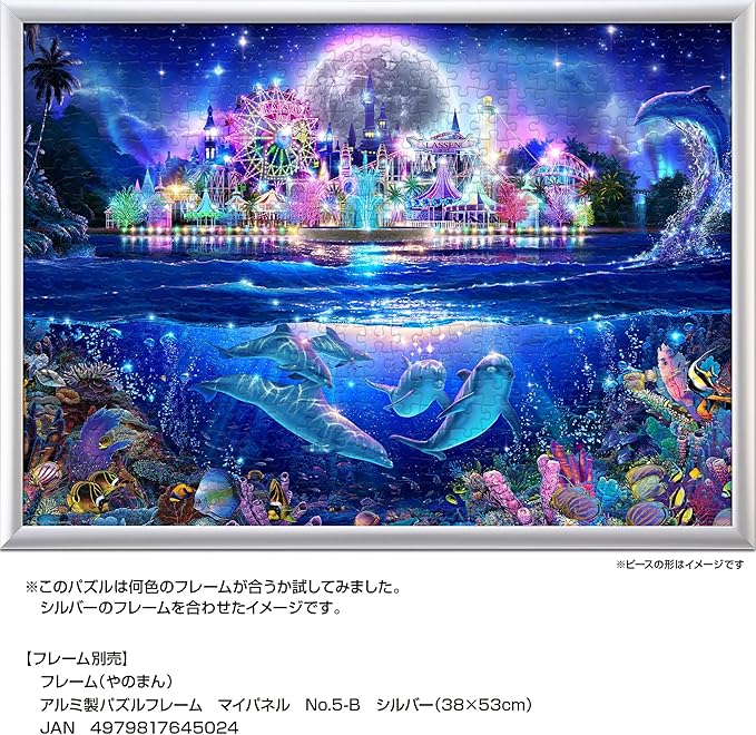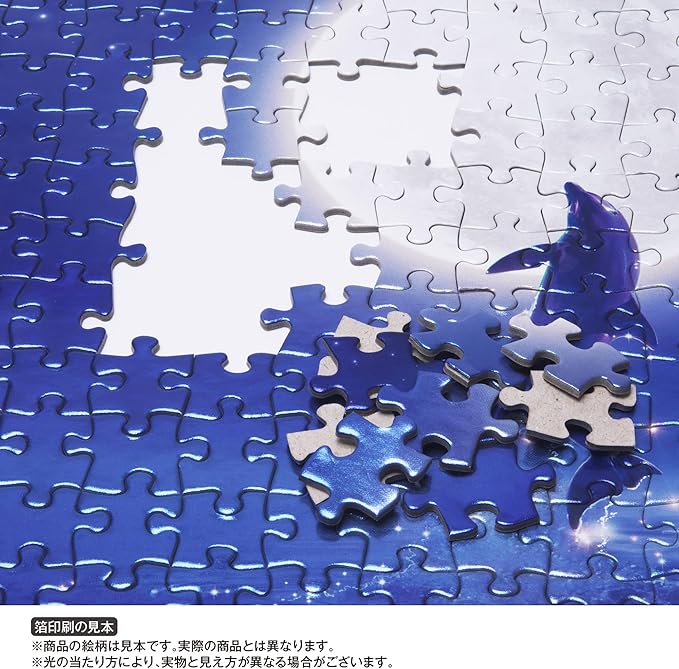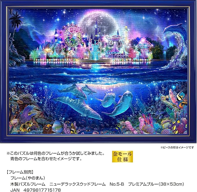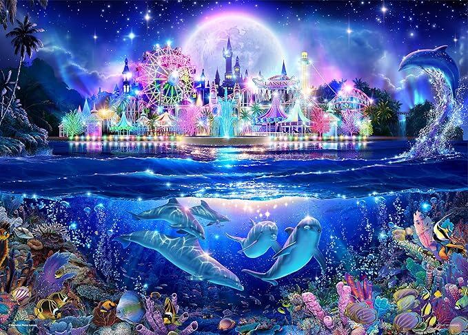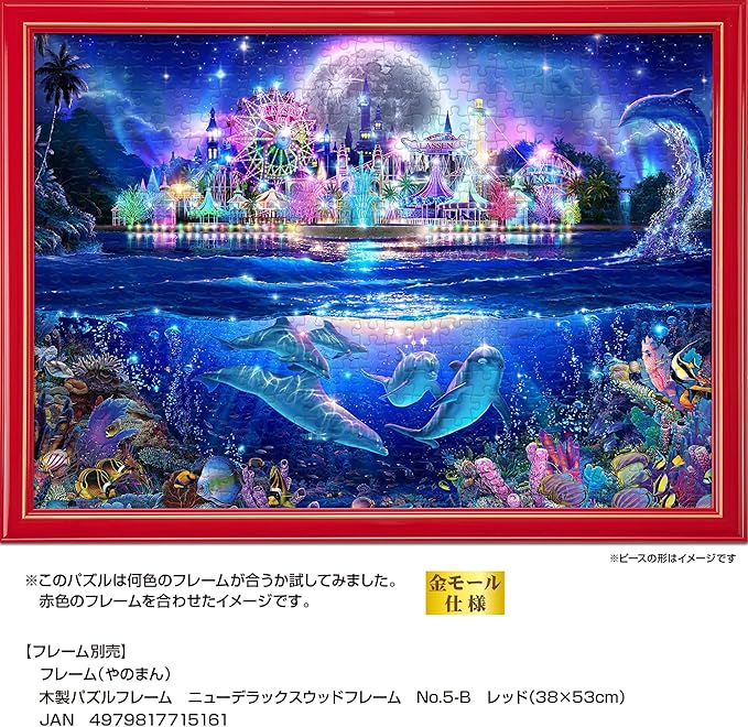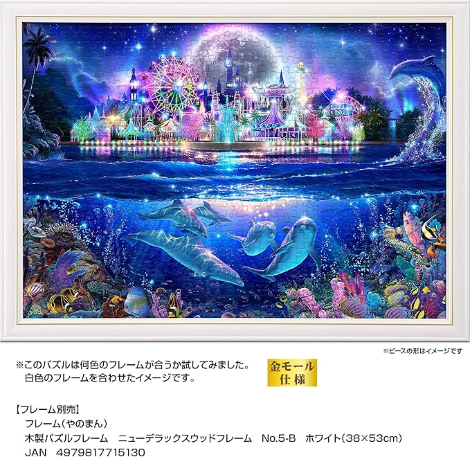 海中を泳ぐイルカとサンゴ礁の融合、月明かりも美しくまるで夢の時間へと誘うかのような1枚。箔印刷により豪華絢爛なジグソーパズルを実現。