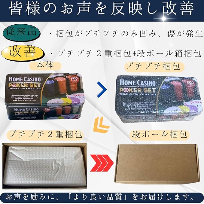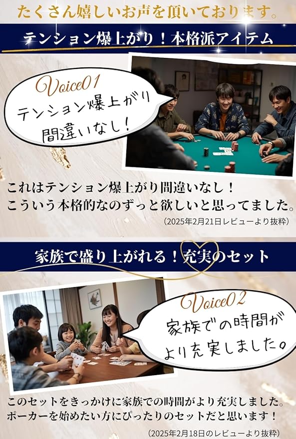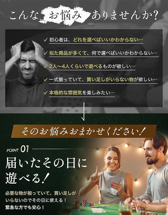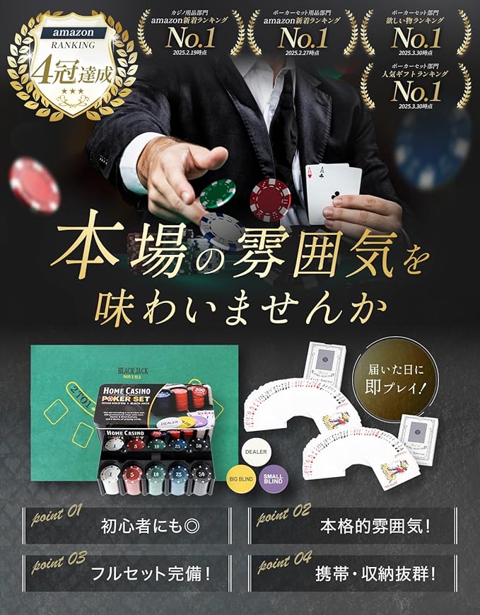 ✅特徴 ポーカーチップ200枚:数字表記つきで初心者でも安心。程よい重みがあり、本格的な「カジノチップ」の雰囲気を再現。トランプ2デッキ:1つが使えなくなっても安心。しっかりとした作りでスムーズにシャッフル可能。ポーカーセットやボードゲームでも活躍します。 プレイマット(58 90cm):ポーカーやブラックジャックに対応。自宅で気軽に本格的なカジノゲームの雰囲気を味わえます。付属ボタン:DEALER・BIG BLIND・SMALL BLINDが揃っているので、テキサスホールデムのルールもそのまま楽しめます。コンパクト収納:24 12 10.5cmのケースにすっきり収まるため持ち運びやすく、収納も簡単。友人や家族との集まり、パーティーゲームにも最適です。 ♠Point 01 届いたその日に遊べる! 必要な物が揃っていて、買い足しがいらないのでその日に使える!緊急な方でも安心!