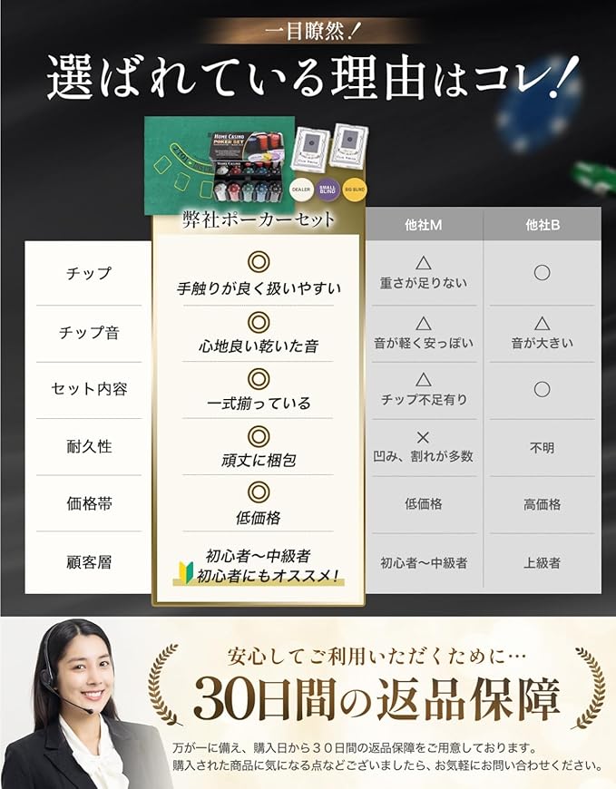 ✅30日間の返品保障 万が一に備え、購入日から30日間の返品保障をご用意しております。購入された商品に気になる点などございましたら、お気軽にお問い合わせください。 ✅【使用上の注意】 ・小さな部品が含まれているため、小さなお子様の手の届かない場所に保管してください。 ・推奨年齢:6歳以上 ・チップや小さな部品を口に入れないようご注意ください。誤飲の危険があります。 ・ゲームは節度を持って楽しみましょう。過度な金銭を賭ける行為は法律で禁止されている場合があります。 ・本製品はカジノゲームの練習や娯楽目的で使用するものです。公営ギャンブル以外の賭博行為は禁止されている場合があります。 ・破損や不具合がある場合は使用を中止してください。