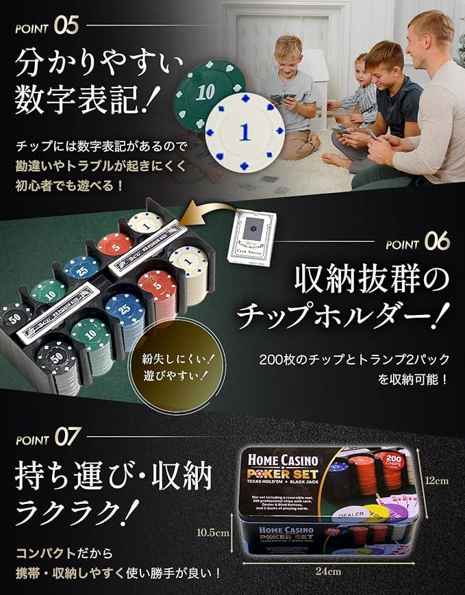 ♠Point06 収納抜群のチップホルダー! 200枚のチップとトランプ2パックを収納出来るので紛失しにくく、遊びやすい! ♠Point07 持ち運びやすい!収納しやすい! 24 12 10.5cmとコンパクトサイズなので携帯・収納しやすく使い勝手が良い!