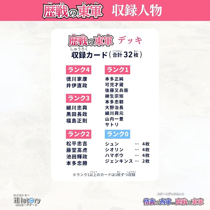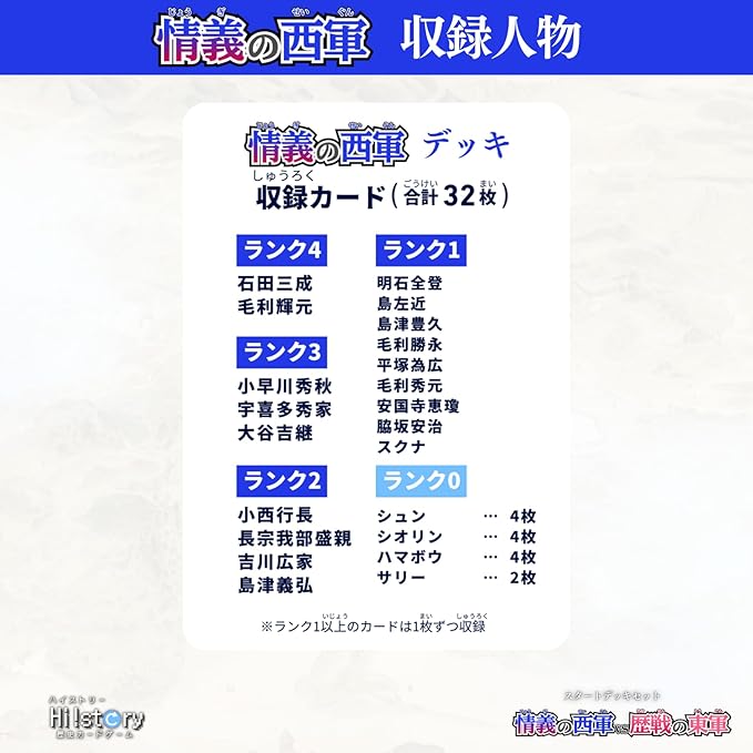 ◆内容物 情義の西軍デッキ (32枚) 歴戦の東軍デッキ (32枚) 説明カード (13枚) QRカード (1枚) 内容物カード (1枚) 収録人物カード(2枚) ◆収録人物一覧は公式HPからご覧ください