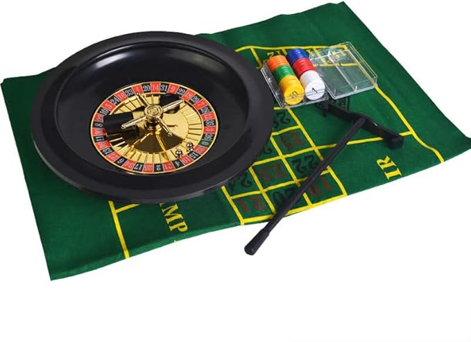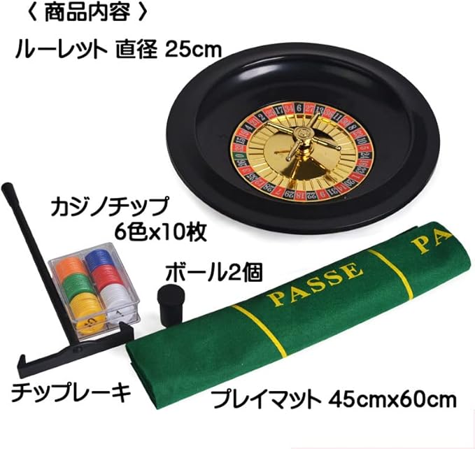 ルーレット(直径約25cm)、厚手タイプフェルトマット(45x60cm)、チップ(6色x10枚)、ボール2個、チップレーキ(トンボ)のセットです。