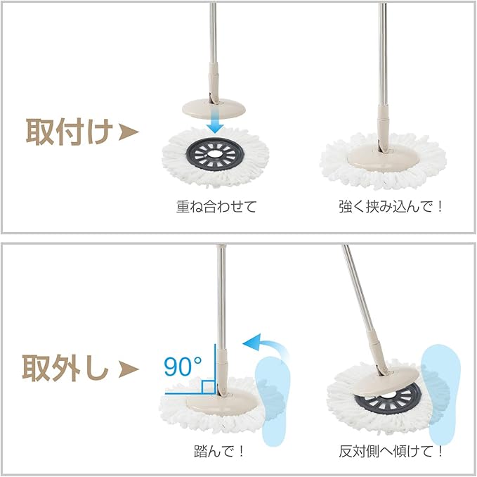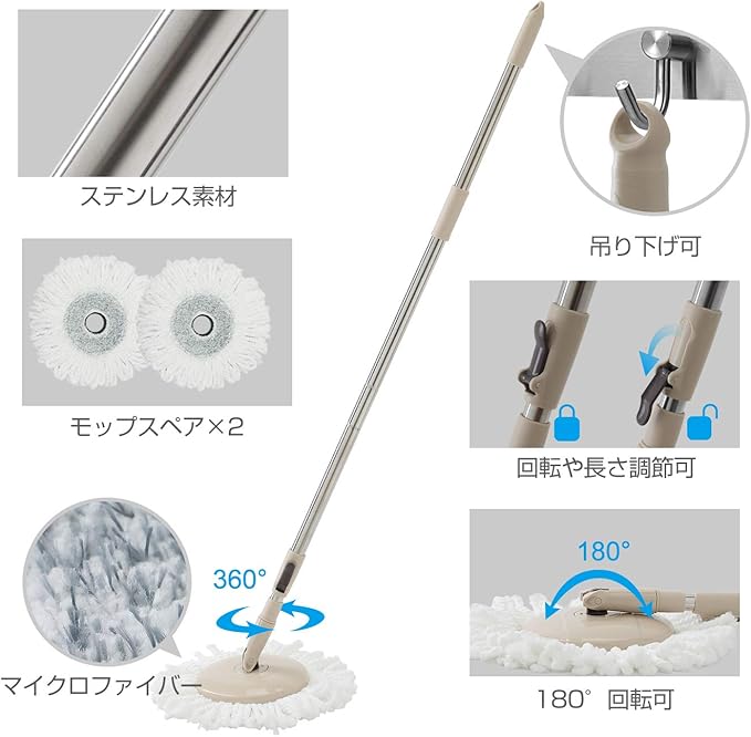 *【注意事項】:モップの洗浄や脱水が順調に進めるため、洗浄や脱水時、ハンドルは必ずバケツと90 真っ直ぐに置いてください。傾けて操作する場合は、洗浄や脱水時、モップヘッドが回転軸から脱落する可能性もあって、高速回転のスピード、洗浄や脱水の効果にも影響がありますので、予めご了承下さい。【品質保証】:本製品につきまして、ご不明点やご質問がございましたら、是非こちらのカスタマサービスまで、ご連絡を頂けると迅速に対応致します。お客様にご満足頂けるよう精一杯対応いたします。もし不良品あれば無償で良品と交換させていただきますので、ご安心ください。