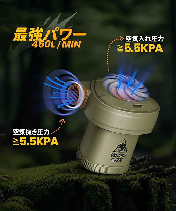 OneTigris ECOPLUSE 電動エアーポンプ キャンプ電動ポンプ Type-C充電式 450L/min 大容量4000mAh 5.5Kpa 空気入れ 空気抜き ノズルセット付き 小型 軽量 収納袋付き エアマット/浮き輪/エアーソファー/プールに対応