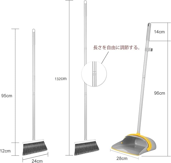 【自由調節 延長ポール付き】人体デザインに適合、ほうきの高さは95〜127 cm、曲げの問題に別れを告げる、一本の延長ポールが付いていますので、ほうきにもちりとりにも使用でき、場所によってご自由に組み合わせます。例えば、天井を掃除する時は延長ポールを使用して長さは127cmになります。【適用場所】おしゃれなデザインで幅広く使用され 石床も木床も、部屋、屋外、玄関、ベランダ、美容室、コンビニ、会社、庭、ガレージ、ペットショップ 学校どが掃除できます。